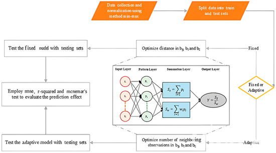 GCW-GRNN algorithm is defined as the same as the GTCW-GRNN algorithm, but there is no time component in the GCW-GRNN algorithm—the transition function is the product of location and feature components. Figure 2 depicts the general form of the GTCW-GRNN algorithm.