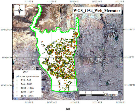 The data were collected using the records of real estate transaction data and retrieved from the real estate registration system of Iran. These data span February, May, August, and November, of 2017, 2018, and 2019 and include 7464 registered transactions. Each point represents a building parcel. In cases where multiple points are assigned to a single parcel, we drew a circle with a diameter equal to the number of points (in centimeters) to avoid any distortions in the calculations. The preprocessing reduced the number of records to 7161. Seventeen influential independent variables were identified after considering previous articles and related data. The dollar price was included in the list of factors used in housing price modeling since the exchange rate influences housing prices in addition to the physical attributes of the housing and the accessibility to urban services [36,37]. Table 2 captures these variables.
