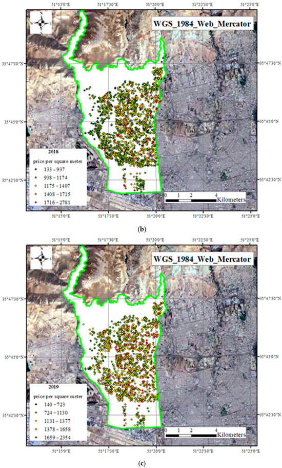 Geographical distribution of the price per square meter of residential units in 2017 (a), 2018 (b), and 2019 (c) in dollars—district 5 of Tehran municipality.