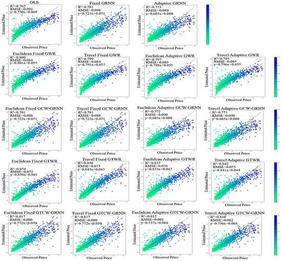 The GRNN, GCW-GRNN, and GTCW-GRNN algorithms are used to investigate the efficiency of the developed models. The heterogeneity of the housing price data in space, time, and physical features is investigated using OLS, GWR, and GTWR algorithms. Figure 4 shows the Root Mean Square Error (RMSE) and R-Squared results for both fixed and adaptive kernel forms, and ED/TD. The fixed form performs better than the adaptive kernel in all cases. The maximum difference of the R-Squared indicator between these two kernels belongs to the Euclidean GTWR algorithm—0.017. The provided results for the GWR, GCW-GRNN, GTWR, and GTCW-GRNN algorithms are almost the same, with a slight difference when the kernel is the same and ED or TD is used. The RMSE and R-Squared indicators in fixed GCW-GRNN and fixed GTCW-GRNN have the same value. In OLS, the R-Squared indicator is 0.762. In GWR, the R-Squared indicator in all fixed, adaptive, ED, or TD is higher compared to the OLS algorithm.