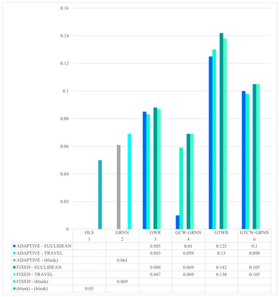 As the observation points are dense, the fixed kernel always has a better performance compared to the adaptive kernel. Using a fixed kernel in GRNN, GWR, GCW-GRNN, GTWR, and GTCW-GRNN models improved the average of the R-Squared indicator by 0.008, 0.003, 0.010, 0.012, and 0.006, respectively. Using a fixed kernel, therefore, always results in higher R-Squared and lower RMSE. The GRNN is faster than OLS. OLS has no parameter to be set during the training process, while the bandwidth of the physical features has to be determined for the GRNN model and, therefore, training the GRNN is slower. GCW-GRNN and GTCW-GRNN have one parameter more than the GWR and GTWR models. But considering the high speed of the GCW-GRNN and GTCW-GRNN models, their training takes less time compared to GWR and GTWR. Using TD instead of ED, generally, makes the value of |Z| resulting from McNemar’s Test less than 2.575 at a 99% confidence level. The biggest difference occurs in comparing Travel Fixed GTCW-GRNN and Euclidean Fixed GTCW-GRNN models, for which the value of |Z|, in this case, equals 1.732. Therefore, using TD instead of ED does not make a significant difference at the 99% confidence level.