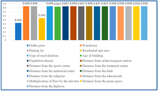The technique with the best results is the GTWR method with a fixed kernel and Euclidean distance. As a consequence, each independent variable was eliminated independently to examine the sensitivity of each independent variable to the dependent variable, which is the housing price. The Euclidean Fixed GTWR model was then applied to the remaining variables, with the findings shown in Figure 7. Figure 7 shows that the adjusted coefficient of determination from the Euclidean Fixed GTWR method will be equivalent to 0.425 if the exchange rate variable (dollar price) is removed from the independent variables to model the housing price. The exchange rate variable will thus have the most effect on house price modeling. The area of the residential unit has the most influence on housing price modeling after the exchange rate variable. The modified determination coefficient will equal 0.544 if the residential unit area variable is removed from the independent variables in the housing price modeling. The variables of building age, distance from a sports center, distance from green space, distance from the industrial center, distance from a fault, population density, and distance from a medical center have a greater impact on the housing price modeling at the 95% confidence level as well.