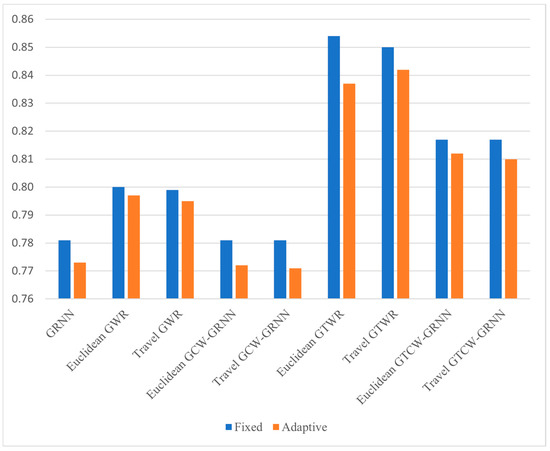 In order to compare the adjusted coefficient of determination in different fixed and adaptive modes, Figure 9 was prepared. Figure 9 is a summary of Figure 4 for different fixed and adaptive modes in the investigated models. As it is clear in this figure, in all models, the fixed mode is more accurate than the adaptive mode.