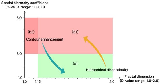 The spatial hierarchy coefficient (C) characterizes gradient distribution order of building clusters along depth axes, determining the structural organization of visual information. Lower C values reflect progressive layering (low–near, high–far) enhancing spatial legibility; higher C values indicate stratification fractures disrupting visual coherence.
