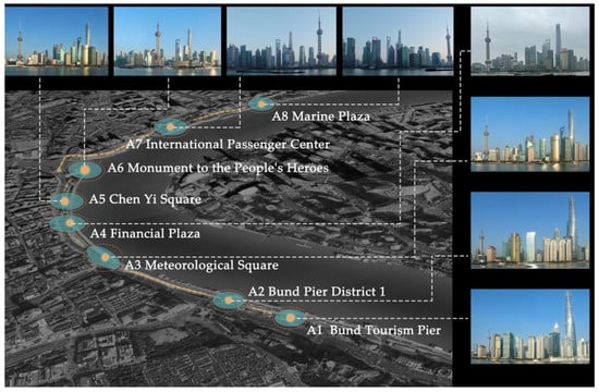 The final eight observation points included: Bund Tourism Pier (A1), Bund Pier District 1 (A2), Meteorological Square (A3), Financial Plaza (A4), Chen Yi Square (A5), Monument to the People’s Heroes (A6), International Passenger Center (A7), and Marine Plaza (A8) (see Figure 3).