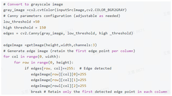The original input image had a resolution of 1920 × 1080 pixels. First, the BGR color space image was converted to grayscale using the OpenCV’s cv2.cvtColor function with the parameter cv2.COLOR_BGR2GRAY, serving as the input for Canny edge detection. The Canny algorithm, renowned for its noise resistance and edge continuity advantages [22], was implemented with dual-threshold filtering (low threshold = 50, high threshold = 150) via the code cv2.Canny(gray_image, 50, 150), generating a binary-edge image edges, where edge pixels were marked white (255) against a black background (0). For vertical edge extraction, the program iterated column-wise across the image width, scanning pixels from top to bottom in each column to record the first detected edge pixel (first occurrence value: 255). This process was implemented through nested loops, with the core code shown in Figure 4: