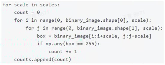 Iterate through each box size (scale), partition the image grid with a step size equal to scale, and count boxes containing skyline contours, as shown in Figure 6.