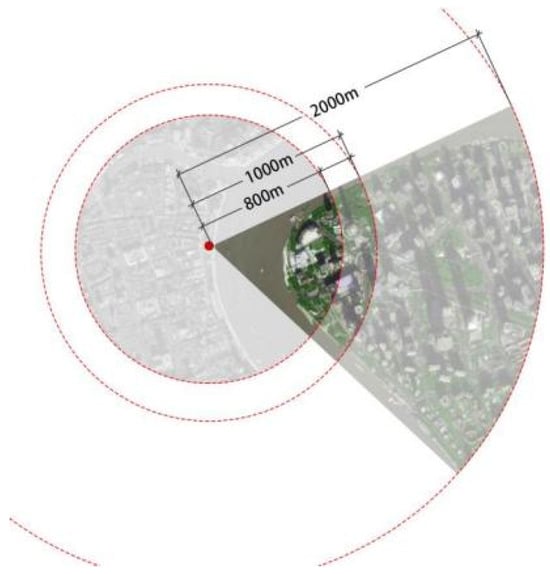 The 600–800 m range represents a critical perceptual boundary where architectural detail dissolves and the skyline contour becomes the dominant visual feature. Integrating these thresholds with the Huangpu River’s width and Lujiazui’s building density, this study delineates three spatial hierarchy zones: