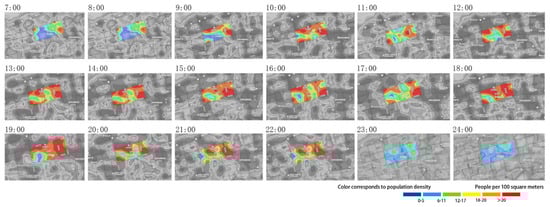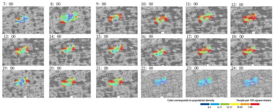 Figure 4), the following conclusion can be drawn: the residential areas of Dajiefang and Gongxiang Street are more distributed, indicating that the heat value of these two neighborhoods is mainly influenced by the resident population. The distribution of commercial formats in the neighborhoods of the old commercial port is relatively concentrated and dense, and the heat value mainly comes from tourists. The reason for the low foot traffic in the neighborhoods of Zhongshan Park is that the park is relatively closed, making it difficult to attract foreign tourists. There are large areas of traditional residential buildings in the Gospel neighborhood, most of which are vacant. The Longxiang Cloth Store neighborhood is the office space of the Jinan Public Security Bureau, so the vitality of the two neighborhoods is relatively poor.