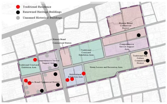 49]. For those newly added business clusters that do not conform to the style of the neighborhood, they should be appropriately transferred and replaced. This helps to maintain the overall style and characteristics of the neighborhood, while meeting the diverse needs of residents and tourists. In the functional blocks of the existing protection plan, designers not only need to retain traditional formats that provide residents’ living services, such as grocery stores and tea houses, but also actively implant new formats, such as creative markets and art exhibitions, to enhance the vitality and attractiveness of the block.