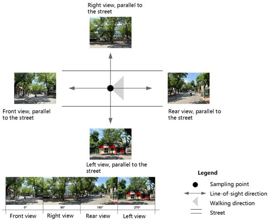 To measure the human perspective data as much as possible, the camera angle is perpendicular to the direction of the human eye’s perspective, that is, level view. By taking human perspective real-life images of the four viewpoints before, after, left, and right of the collection point, the point by point four images can basically obtain the entire street view of the collection point, making the final data calculation more realistic. Capture point shooting is as shown in