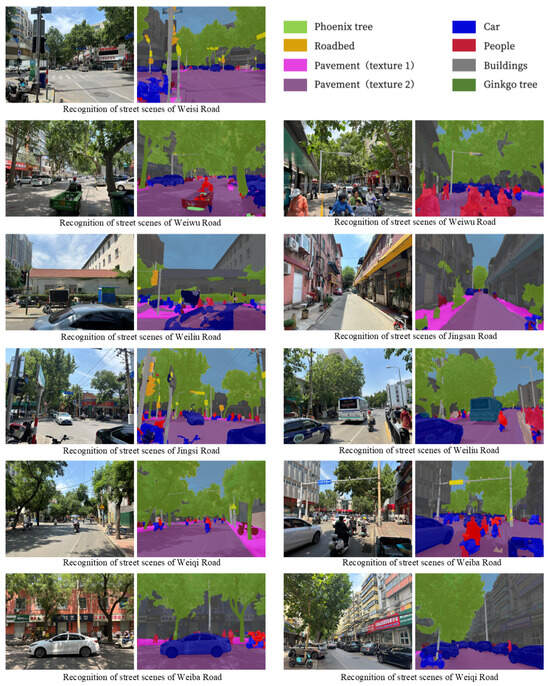 A total of 288 images from four perspectives at 72 collection points were semantically segmented using a model to obtain the zoning and proportion of different elements in street scenes such as buildings and greenery. The semantic segmentation of the collection points is shown in
