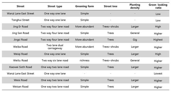 It can be inferred that (1) road width affects green visibility. By controlling variables, examples include Weiba Road and Weiqi Road. The greening form of Weiba Road is more diverse than that of Weiqi Road, and the planting density of the two is similar. However, due to the different street widths, the perception of greenery on Weiqi Road is higher. (2) The form of greening affects the green visibility. Compared to Wanzi Lane East Street, both Tonghui Street and Wanzi Lane East Street have no roadside trees for greening. However, occasional vegetation greening along Wanzi Lane East Street can also affect the overall green visibility perception. (3) Planting density affects green vision rate. Compared to Jing Si Road, Jing Er Road has similar road width and greenery forms, but Jing Si Road has a higher planting density, resulting in more concentrated visual greenery and higher green visibility when walking.