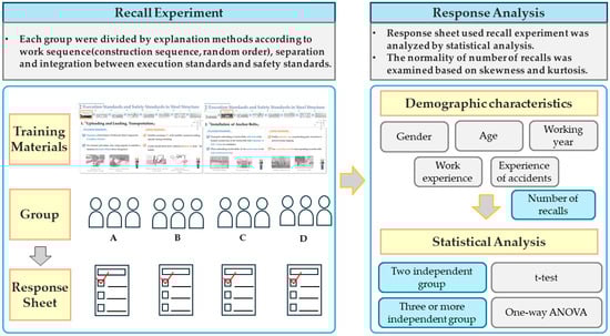 To verify these hypotheses, experimental groups were formed to analyze differences in recall information among them. After categorizing groups based on the delivery method according to the work sequence and a random organization of training materials, new workers were trained, and the cognition of the educational content was verified to ascertain the level of cognition and the correlation among components.