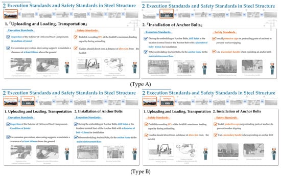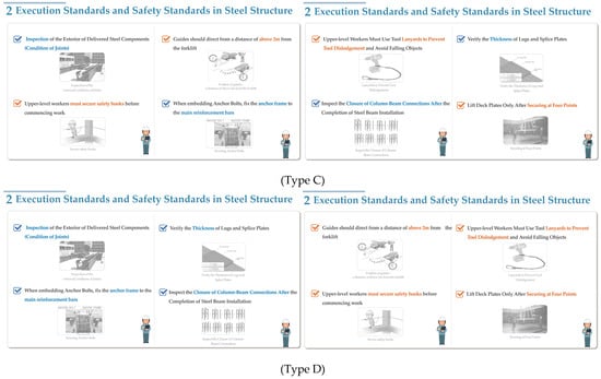 Type A training materials were structured to integrate two execution standards and two safety standards per construction sequence stage. In contrast, Type B materials, while maintaining the same stage-by-stage structure as Type A, differed by explaining all execution standards first, followed by detailing the safety standards relevant to each construction stage. Type C and type D training materials were organized randomly without considering the work sequence. However, to maintain uniformity across all experimental groups, the materials were composed of eight charts (four standards per chart), with the content equivalent to type A and type B. For Type C, regardless of the work sequence, each training chart was structured to integrate two execution standards and two safety standards. Type D, irrespective of the work sequence, described each execution standard in a random order, followed by randomly arranging the safety standards in the same manner.