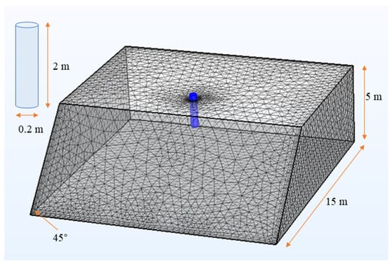 To account for boundary effects on the pile foundation, the pile foundation model is positioned at the center of the gangue mountain. The pile has a length of 2 m and a diameter of 0.2 m. The geometric models of the gangue mountain and pile foundation are shown in Figure 1. The finite element method discretizes the continuous solution domain into a combination of finite elements. The geometric model is meshed using tetrahedral elements, and finer mesh refinement is applied to critical areas, such as corners and slopes. The mesh comprises 87,928 tetrahedral elements, 16,273 prism elements, and 104,286 total elements, with 415 edge units and 20 vertex units. The minimum element quality is 0.1109, the average element quality is 0.6908, the mesh volume ratio is 1.009 × 10−4, and the mesh volume is 937.5 m3. The geometric shape functions are linear elements. For temporal discretization, considering the real-time conditions of spontaneous combustion in the gangue mountain, the simulation is set as a transient analysis. The solver is configured for transient calculations, with the time unit set to years, a total computation period of 5 years, a time step of 0.1 years, and a relative tolerance of 0.01.