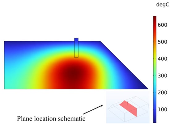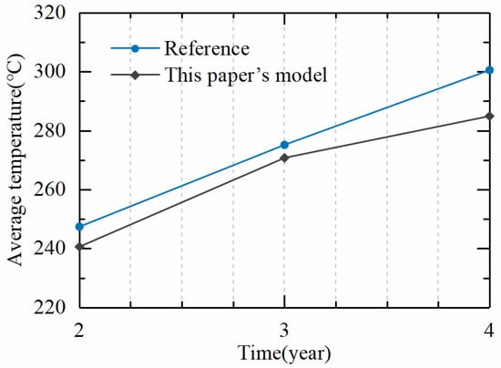 To validate the reliability of the numerical simulation, the development of coal gangue spontaneous combustion can be assessed by analyzing the temperature variation patterns of the model. Figure 2 compares the average temperature of the gangue mountain spontaneous combustion obtained through finite element simulation over 2–4 years with the data from reference [26], while Figure 3 shows the temperature distribution in the fifth year of combustion. The numerical simulation yields the following conclusions: