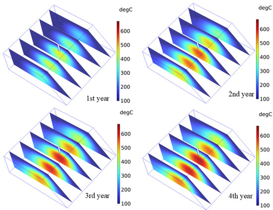 Figure 4 shows the temperature map of spontaneous combustion in gangue mountain for 1–4 years simulated by the numerical model. As can be seen in Figure 4, with the increase in the burning degree of gangue mountain, its high-temperature region also gradually expands. The high-temperature region first appeared in the area below the slope; with growth over time, the high-temperature region will gradually spread to the surrounding area and ultimately cause the whole gangue mountain temperature to increase. If no timely measures are controlled, the spontaneous combustion of coal gangue can generate temperatures as high as several hundred degrees centigrade, seriously affecting the safety of the building structure and the stability of the slope.
