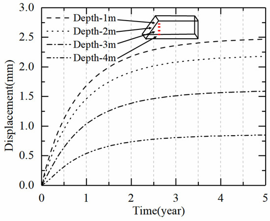 Spontaneous combustion of coal gangue is the main driver of surface subsidence in gangue mountain. Duan et al. [28] pointed out that due to the long years of burning coal gangue, the internal temperature is very high, and the combustible materials are generally calcined into ashes, resulting in the formation of internal cavities of different sizes. In this way, there is constant gangue burnt to ashes, and the small cavities are interconnected due to combustion, gradually changing from small to large and forming an arch. The temperature inside the arch shell is high when encountering a large amount of rainfall; the rain meets the high-temperature gangue and instantly turns into water vapor. When the energy builds up to a certain extent, and the pressure is more than the gangue mountain surface can withstand, it may result in a geological disaster. As the coal gangue burns out, the voids formed internally become increasingly larger and more numerous, potentially leading to the development of arch-shaped structures within the gangue mountain. Therefore, spontaneous combustion of coal gangue hills may induce displacement within the structure, affecting their overall stability. To investigate the internal displacement caused by coal gangue combustion, four measurement points were selected vertically at 1 m intervals from top to bottom in high-temperature zones of the gangue hill. As shown in Figure 5, thermal expansion under rising temperatures drives outward displacement and lateral expansion of the hill. Meanwhile, temperature variations between combustion-affected and unaffected areas result in differential displacement magnitudes. This phenomenon may create elevation differences at the hilltop, potentially leading to uneven ground surface displacement.