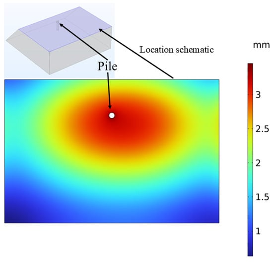 In contrast, the displacement near the base edge of the pile is relatively small. This can be attributed to the greater depth of this region, where stronger constraints limit thermal expansion effects. The maximum displacement of the pile shaft reaches approximately 3.5 mm.