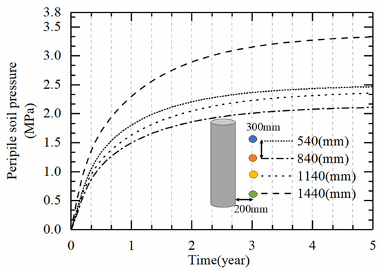 To investigate the variation of soil pressure around the pile under the influence of coal gangue self-heating, measurement points were selected at a distance of one pile diameter (200 mm) from the pile perimeter and depths of 540 mm, 840 mm, 1140 mm, and 1440 mm. The variation in soil pressure at these points due to the coal gangue combustion was analyzed. Figure 7 shows the temporal variation in soil pressure around the pile. As depicted in the figure, with the progression of time, the intensity of coal gangue self-heating increases, resulting in a rise in the temperature of both the gangue mountain and the pile foundation. Consequently, this causes an increase in the soil pressure surrounding the pile. Over the period from the first year to the fifth year, the soil pressure around the pile exhibits a continuous upward trend. Furthermore, the interaction between pile and soil thermal expansion increases soil pressure at the pile–soil interface compared to other areas, while the pressure decreases toward the central portion of the pile.