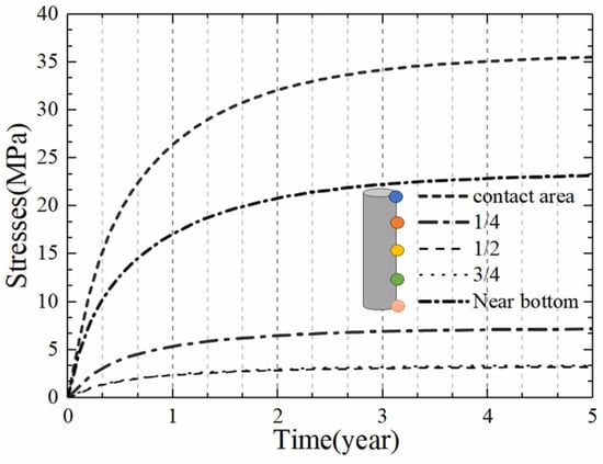 During the spontaneous combustion of coal gangue, the high temperatures generated induce thermal expansion, leading to the development of thermal stress within the pile. As the temperature rises, the internal thermal stress gradually increases (Alice et al. [30]). When the stress exceeds the material’s yield strength, plastic deformation or failure may occur. Due to the greater constraints imposed by the surrounding soil at the bottom, the pile ends experience higher compressive stress compared to the middle section. Additionally, the interaction between the pile and the surrounding soil influences the stress distribution. Differences in thermal conductivity between the soil and the pile material, as well as the thermal expansion coefficient, may cause stress concentration at the interface, resulting in maximum stress at the pile–soil contact surface. Figure 10 shows the stress distribution in the pile. Stress variations under thermal stress were studied at the pile–soil interface; 1/4, 1/2, and 3/4 of the pile length; and near the pile bottom. The thermal stress in the pile changes due to soil constraints during thermal expansion, and its trend aligns with the temperature variation. Higher thermal stresses are observed at the pile–soil interface and near the pile ends due to pile–soil interaction.