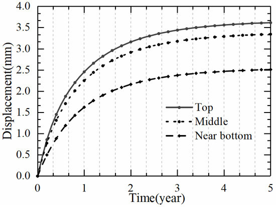 According to the theory of thermal expansion, material displacement due to temperature changes could be described using the thermal expansion coefficient and temperature variation. In the case of coal gangue spontaneous combustion, the temperature gradient induced by the heat source generates thermal expansion within the pile foundation, resulting in displacement. The distribution and magnitude of this displacement are critical for assessing the stability and safety of the pile foundation. Figure 11 illustrates the displacement profile of the pile cross-section, with data collected at three specific points: the pile top, mid-pile, and pile base. Analysis of the figure indicates that displacement is largest in the pile top region, likely due to significant thermal expansion caused by high temperatures generated during the spontaneous combustion of coal gangue. As temperature increases, the thermal expansion effect intensifies, leading to increased displacement of the pile.
