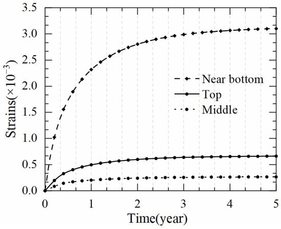 Figure 12 and Table 2 show the strain distribution in the pile foundation at three points: the pile top, mid-pile, and base. The pile’s thermal expansion is constrained by the surrounding soil, and the soil’s expansion is similarly influenced by the pile. This interaction causes localized strain increases. Additionally, due to the differing thermal expansion coefficients between pile foundation materials and surrounding soil under thermal loading, significant strain concentration occurs at both the pile tip and pile head.