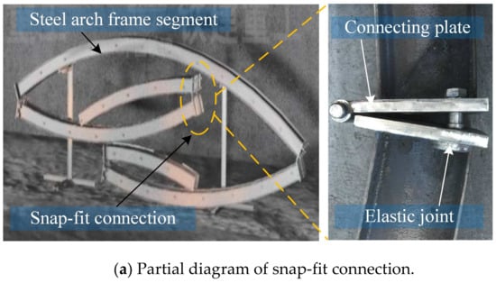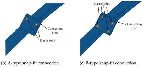 The elastic ring is manufactured from high-quality spring steel, providing excellent elasticity and strength. The efficacy of folding steel arch frames in providing structural support is predominantly contingent on the design of snap-fit connections. Past research has indicated that when the thickness of the end plate exceeds 16 mm, it ceases to exert effective control over the nodal bearing capacity [34]. Consequently, this paper establishes the thickness of the snap-fit joint connecting plate at 16 mm, ensuring that the load-bearing capacity of the snap-fit joint is primarily determined by the number of enclosed elastic joints and the dimensions of the elastic joint. Two types of snap-fit connections are introduced, incorporating two elastic joints and four elastic joints, designated A-type and B-type, respectively (refer to Figure 2b,c).