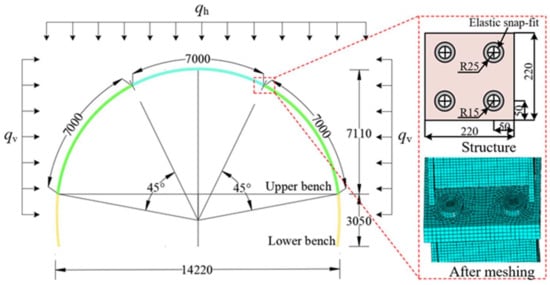 The A- and B-type snap-fit connections are both positioned at a 45° angle to the arch crown. The folding steel arch frame is constructed using No. 16 I-beams, and the material parameters for the folding steel arch frame are presented in Table 2. The initial support steel arch frame of the tunnel is subjected to surrounding rock pressure, with its load decomposed into horizontal pressure qv and vertical pressure qh acting on the steel arch frame. Therefore, the effect of the surrounding rock on the folding steel arch frame can be equivalently simulated by applying horizontal and vertical pressures. According to the Code for the Design of Railway Tunnels (2016) [36] regarding the calculation method for deep-buried tunnel loads, the vertical pressure qh is set to 259.2 kPa, and the horizontal pressure qv is set to 103.7 kPa.