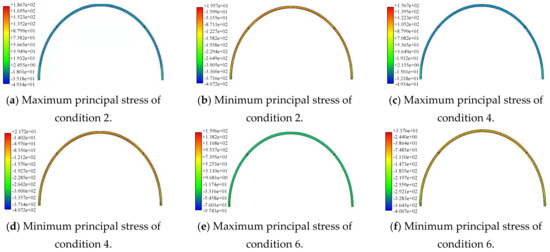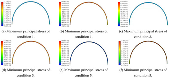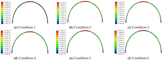 The stress distribution of folding steel arch frame structures with A- and B-type connectors under different elastic joint diameters is illustrated in Figure 6 and Figure 7, respectively. As depicted in the figures, it is evident that the maximum stresses in folding steel arch frames with various elastic joint diameters and quantities exhibit a symmetrical distribution, with compression being the primary stress. The highest compressive stress occurs at the crown, gradually decreasing towards the left and right arch feet. Notably, stress concentrations are predominantly localized at the arch feet positions. Therefore, reinforcement at the arch feet positions is essential during the erection process of folding steel arch frames to prevent structural damage at these locations, ensuring the overall load-bearing performance of the arch. When the type of snap-fit is constant, the maximum principal stresses in A-type folding steel arch frames show a negative correlation with the increase in elastic joint diameter.