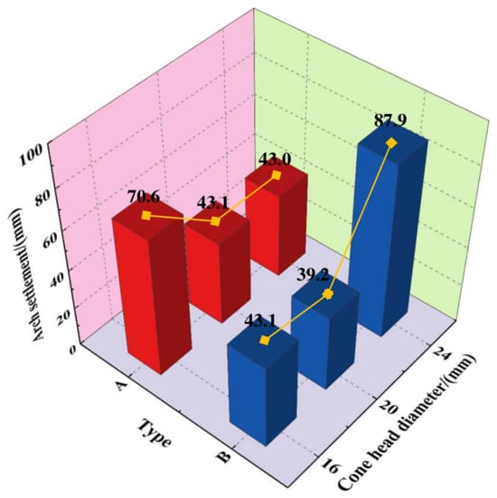 Using various joint diameters, the vertical displacements of A- and B-type snap-fit connected folding steel arch frames are illustrated in Figure 4. It can be observed that the deformation settlement of folding steel arch frames under surrounding rock pressure is not influenced by the type of snap-fit, exhibiting a symmetrical distribution with maximum vertical displacement at the arch crown, gradually decreasing towards both sides of the arch feet. The maximum vertical displacements for folding steel arch frames with A- and B-type snap-fit connections under different joint diameters are 70.6 mm, 43.1 mm, and 43.1 mm, and 43.1 mm, 39.2 mm, and 87.1 mm, respectively. The maximum vertical displacement of folding steel arch frames is significantly influenced by the snap-fit type and joint diameter. When the joint diameter does not exceed 20 mm, the maximum vertical displacement of both A- and B-type snap-fit steel arch frames decreases with increasing joint diameter. Moreover, the maximum displacement of B-type folding steel arch frames is noticeably smaller than that of A-type folding steel arch frames. This is attributed to the increase in stiffness at the snap-fit joint due to the larger elastic joint diameter and the greater number of joints, resulting in a gradual reduction in the arch crown settlement of folding steel arch frames. Therefore, within the joint diameter range of no more than 20 mm, B-type snap-fit effectively enhances the load-bearing capacity of the folding steel arch frame, demonstrating advantages in controlling arch deformation and reducing surrounding rock settlement. However, when the joint diameter exceeds 20 mm, A- and B-type snap-fit folding steel arch frames exhibit varying degrees of increased maximum vertical displacement with larger joint diameters. Additionally, the maximum displacement of B-type folding steel arch frames is significantly greater than that of A-type folding steel arch frames. This analysis suggests that when the joint diameter and quantity surpass certain values, they may weaken the strength and stiffness of the snap-fit connecting plates, leading to an increase in folding steel arch frame settlement, which is unfavorable for surrounding rock stability.