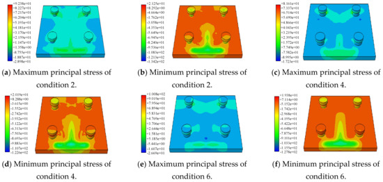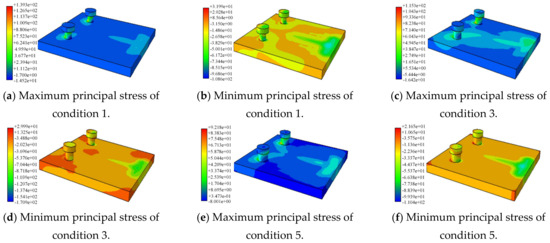 By extracting the maximum and minimum principal stresses of A-type and B-type snap-fit flexible joints under different working conditions, variation patterns can be obtained, as shown in Figure 10. As depicted in Figure 10a, the maximum principal stress of A-type snap-fit connections decreases gradually as the joint diameter increases. Furthermore, from a force perspective of flexible joints, increasing the joint diameter can effectively enhance the safety and resistance to damage of the snap-fit joint. Regarding the minimum principal stress, the change in joint diameter has a more significant impact on its maximum principal stress. When the joint diameter increases from 16 mm to 24 mm, the maximum principal stress decreases by 47.2 MPa, representing a reduction of approximately 33.8%. However, the rate of decrease in the maximum principal stress diminishes when the joint diameter exceeds 20 mm. By extracting the maximum and minimum principal stresses of B-type snap-fit flexible joints and analyzing the influence of different joint diameters on the principal stresses, we can observe a trend in their variation, as shown in Figure 10b. The maximum principal stress of B-type snap-fit connections exhibits a trend of initially decreasing and then increasing with the increase in joint diameter. This phenomenon is attributed to the fact that an excessively large joint diameter can alter the strength and stiffness of the connecting plate where the joint is located, thereby weakening the overall connection effect of the snap-fit assembly. When the joint diameter is 20 mm, the maximum principal stress of B-type snap-fit connections reaches its minimum value of 81.6 MPa.