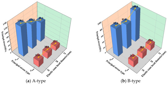 The values are 70.4 MPa, 68.4 MPa, and 51.6 MPa, indicating the enhanced load-bearing capacity of A-type steel arch frames with increasing joint diameter. For B-type folding steel arch frames, when the joint diameter is below 20 mm, the maximum principal stress remains relatively stable at 49.3 MPa. However, when the joint diameter exceeds 20 mm, a noticeable increase in the maximum principal stress is observed, reaching 97.4 MPa. This increase may be attributed to the adverse effects of excessively large joint diameters on the strength of the connecting plates, resulting in a decline in the load-bearing capacity of the folding steel arch frame.