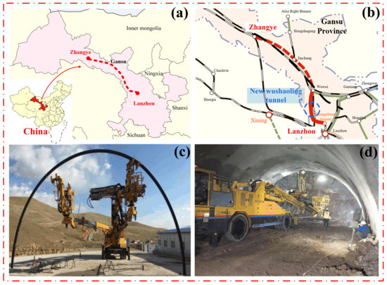 The New Wushaoling tunnel is a pivotal project in the construction of the Lanzhou to Zhangye No. 3 and No. 4 Line Railway, specifically the Chuan Airport to Wuwei section. Positioned to the east of the existing Lanzhou–Wuwei No. 2 Line’s Wushaoling Extra-Long Tunnel, the tunnel is approximately 210 m and 571 m away from the existing right-line tunnels at the Zhangye and Lanzhou ends, respectively. The rail’s surface elevation is approximately 36 m higher at the Zhangye end and 110 m higher at the Lanzhou end compared to the Zhangye end of the existing Wushaoling Extra-Long Tunnel. This newly designed tunnel is a double-track railway tunnel with a design speed of 250 km/h (see Figure 13). Situated in Dachaigou Town, Tianzhu County, at the entrance and in Anyuan Town at the exit, the tunnel traverses the Wushaoling Mountain range. It spans from DK160+920 to DK178+045, with a maximum burial depth of 952 m and a total length of 17,125 m. The geological conditions comprise 3275 m of Class III surrounding rock, accounting for 19.12%; 6680 m of Class IV surrounding rock, constituting 39.01%; and 7275 m of Class V surrounding rock, making up 41.87%. To address challenges such as high erection risks, intensive labor requirements, and low erection precision associated with the erection of folding steel arch frames in the tunnel, from October 2020 to March 2021, the China Railway 15th Bureau Group Fifth Engineering Co., Ltd. conducted a research trial for tunnel machining arch frame erection in the entrance section of the New Wushaoling tunnel, spanning DK160+920 to DK168+941. The average burial depth of the trial section is 450 m, and the geological conditions are complex, featuring exposures of sedimentary, igneous, and metamorphic rocks, with sedimentary rocks being predominant.