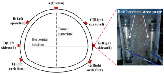 To avoid the influence of irrelevant factors, two representative sections with favorable subsurface conditions and similar characteristics were selected for the mechanical arch construction test at the import site. These sections are located at the monitoring faces DK162+100 and DK162+105, with a burial depth of 260 m and IV surrounding rock. The arch construction was carried by opening excavation at the monitoring faces. Two arch frames were constructed using the mechanical arch method at the monitoring faces, namely an A-type snap-fit connection folding steel arch frame (hereinafter referred to as the A-type steel arch) at the DK162+100 monitoring face and a B-type snap-fit connection folding steel arch frame (hereinafter referred to as the B-type steel arch) at the DK162+105 monitoring face. Monitoring points were set at key positions along the excavation profile and installed at seven measurement points on the monitoring faces, as shown in Figure 14. From top to bottom, these points include the arch crown, left and right spandrels, left and right sidewalls, and left and right arch feet. The installation of the field measurement instruments is shown in Figure 14, with TZX-R-type tension steel strain gauges installed on both sides of the steel arch rib plate. The changes in the steel arch’s vibrational frequency after loading are recorded daily to measure the dynamic rules of steel arch axial loading. Due to the axial symmetry of steel arch loading, only the mechanical responses of the two steel arches at the arch crown, left spandrels, left sidewalls, and left arch feet are compared in this section for analysis.