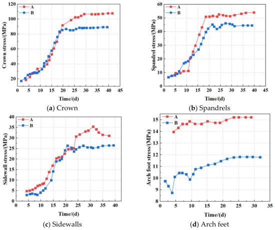 Figure 15 shows stress monitoring curves for the steel arch frames. The two types of steel arch frames exhibited the maximum stress values at the crown of the arch due to the key node effect, as the crown is the primary load-bearing point. Both A-type and B-type steel arch frames showed significant differences in axial stress at the crown, arch soffit, sidewall, and arch springing; the A-type steel arch frames exhibited higher stress levels compared to the corresponding components of the B-type steel arch frames, indicating that under similar conditions, the A-type steel arch frames experience greater axial stress, while the B-type steel arch frames demonstrated better support performance with lower overall stress levels. The axial stress changes in both steel arch frames exhibited similar trends over time, but the A-type steel arch frames showed a higher rate of stress increase. The stress at the crown of the steel arch frames gradually reached values close to 25 MPa before stabilizing briefly, followed by a rapid increase from the 10th to the 20th day. This trend was closely associated with the progress of the lower bench excavation. Before the 10th day, the stress changes at the crown of the steel arch frames were relatively small, primarily due to the diminishing influence of the creation of the construction face. However, after the 10th day, the stress increase rate in the steel arch frames became significantly larger, indicating that the lower bench excavation had a greater influence on the axial stress of the steel arch frames at the crown. Additionally, the A-type steel arch frames showed higher rates of stress increase compared to the B-type steel arch frames at the arch soffit and sidewall, while the B-type steel arch frames exhibited a higher rate of stress increase at the sidewall compared to the A-type steel arch frames. However, after the stress stabilized, the A-type steel arch frames showed higher stress levels in all components compared to the corresponding components of the B-type steel arch frames. These differences further indicate that under similar conditions, the A-type steel arch frames experience greater axial stress, while the B-type steel arch frames demonstrate better support performance with more reasonable axial stress distribution, reduced concentration of stresses on the connection plates, and improved overall load-bearing capacity and safety. This result further validates the stability and reliability of the B-type snap-fit connection folding steel arch frames under large loads and complex construction conditions, providing effective support for the redistribution of stresses caused by removal of load during bench excavation, thereby effectively controlling rock deformation. This makes the B-type snap-fit connection folding steel arch frame an ideal choice for optimizing the structure of folding steel arch frames.
