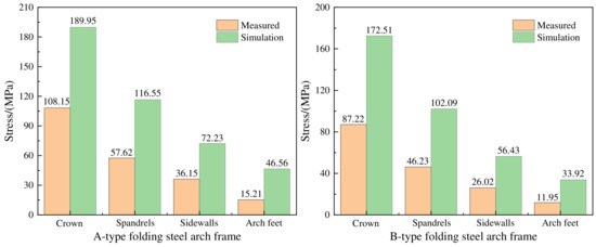 Based on experimental data, a comparative analysis was conducted between the A-type and B-type steel arch frames regarding the stress values measured at the arch crown, spandrel, sidewall, and arch foot. The results (Figure 16) indicate that regardless of the type of connection, the numerical simulation results consistently exceeded the measured values, likely due to delays in steel arch installation after excavation, allowing the surrounding rock to release some energy. However, both the numerical simulation and field monitoring results showed similar trends in terms of stress changes. Additionally, the B-type steel arch frames exhibited lower stress levels at all components compared to the corresponding components of the A-type steel arch frames. This result is primarily attributed to the B-type snap-fit connection, which results in more uniform stress distribution and reduces the concentration of stresses on the connection plates, thereby improving the overall load-bearing capacity and safety of the steel arch frames. These findings further validate the stability and reliability of the B-type snap-fit connection folding steel arch frames under large loads and complex construction conditions. The B-type steel arch frames are capable of providing strong support for the redistribution of stresses caused by the removal of loads during bench excavation, effectively controlling rock deformation. As a result, the B-type snap-fit connection folding steel arch frame represents an optimal choice for optimizing the structure of folding steel arch frames.
