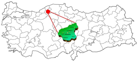 Karabük is a province located in the western part of Türkiye’s Black Sea Region, notable for its establishment and development within the context of architectural history (Figure 1). Administratively, it comprises a total of 6 districts, 80 neighborhoods, and 277 villages (Table 1) []. In the 1930s, Karabük emerged as one of the significant centers of Türkiye’s industrialization efforts. During the Early Republican Period, as part of national goals to expand industrial enterprises, the foundations of the Demir Çelik İşletmeleri (DÇİ, Iron and Steel Enterprises) were laid, accelerating the city’s development. At that time, Karabük was a small village named Öğlebeli, subordinate to the Safranbolu district. The establishment of DÇİ brought about population growth and economic vitality, transforming the region’s status. Karabük became a township of Safranbolu in 1941 and gained district status on 3 March 1953, through Law No. 6068, with 53 villages annexed to it []. On 6 June 1995, Karabük was declared Türkiye’s 78th province under Law No. 22305 [].
