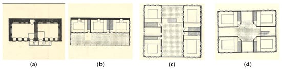 Sedad Hakkı Eldem’s Turkish house plan type examples (Reprinted from Ref. []). (a) Plan type without sofa. (b) Plan type with outer sofa. (c) Plan type with inner sofa. (d) Plan type with middle sofa.