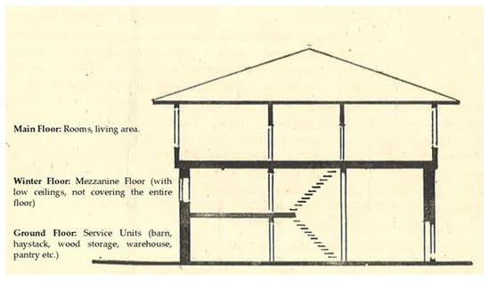Numerous examples of civil architecture from this period have survived to the present day, and the “Turkish House” plan type was implemented not only in the Anatolian region but also in various locations across Asia and Europe, where the empire extended its borders. The first systematic study on the Turkish house, which is also referenced in contemporary research, is Sedad Hakkı Eldem’s book titled Türk Evi Plan Tipleri (Turkish House Plan Types), published in 1954 []. In this book, Eldem discusses the general characteristics, distinctive features, production processes, and deterioration causes of the Turkish house. Based on approximately 1500 measured drawings, he categorizes Turkish houses into four plan types (Figure 4) according to their spatial organization. He notes that the Turkish house is typically a single-story structure, while in multi-story examples, each floor is allocated based on its functional role within the dwelling (Figure 5). Accordingly, the ground floor is in direct connection with the garden and accommodates service units. This level does not serve as a living space, and the facades facing public areas remain solid and windowless. Between the ground floor and the main living floor, there is an intermediate level, which is lower in height than the primary floor and is also referred to as the “winter floor”. The main floor, where the rooms are located, serves as the primary living area and defines the house’s plan type.