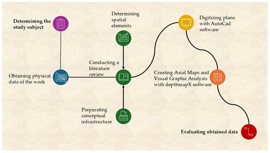 This method was first developed and used by Bill Hillier and Julienne Hanson in the 1970s based on human movement and visual perception []. This method attracts the attention of architects because it can be used both at urban and building scales [,,]. As did Saraçoğlu Gezer and Sultan Qurraie, we had previously chosen to use this method in our study of the square experience in Karabük province []. This method, which has been preferred for many urban studies in a similar form, is preferred in all studies requiring graphical network analysis because it can be worked on an urban scale and because it is a virtual brain that can test the relationships between each of the elements in the city [,,]. It is a method that can be used at the residential scale [,,], public building scale [,,], and even landscape planning [,,], in addition to the urban scale.