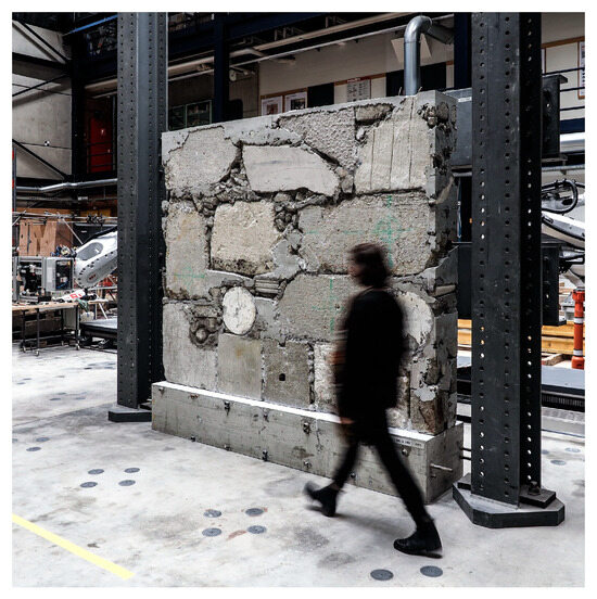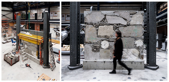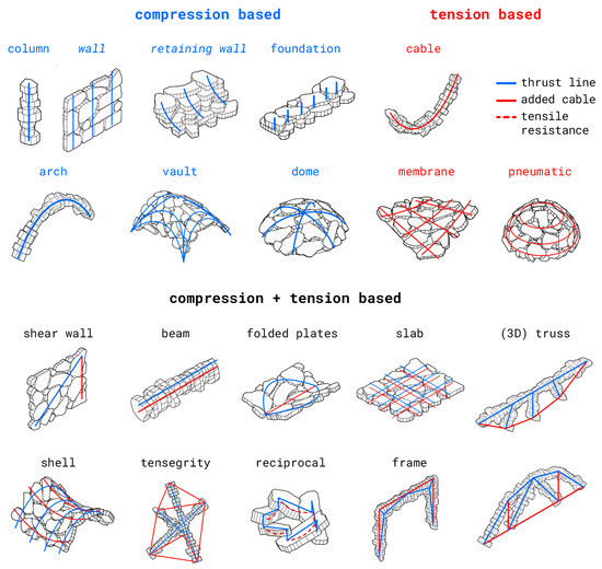 To identify the possible applications of such material for the construction industry, basic structural typologies are gathered from Muttoni and Engel [39,40] and grouped by the dominant form of internal forces: compression, tension, and both. Concrete rubble is considered as the main construction material for each cluster of structural typologies. Combining concrete rubble with tensile elements allows a greater diversity of structural typologies, visible in Figure 7. The concrete rubble units are considered flat, reinforced, 17–30 cm thick, 50–200 cm long, 27–140 cm wide. Based on the opportunities and limitations offered by concrete rubble pieces (see previous subsection), relevant structures to be constructed from such material are identified as compression-based structures. These structures encompass walls, arches, vaults, columns, and foundations. They do not require a tensile capacity, which is suited for the assembly of distinct concrete rubble pieces. Although less optimum, other structural typologies could nonetheless be built, for sculptural, formal, or technical reasons. In this study, the construction of walls is explored due to their prominence in buildings and infrastructures.