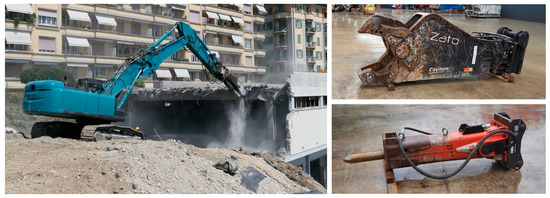 Depending on the demolition method and execution, concrete rubble pieces have distinctive geometries and dimensions. Concrete rubble in Europe is mostly produced by the demolition of concrete structures using hydraulic excavators equipped with crusher or hammer attachments (see Figure 3) [10,11]. Once transformed into rubble, the potential use of concrete waste depends on nearby construction needs and the existing supply to meet these needs.