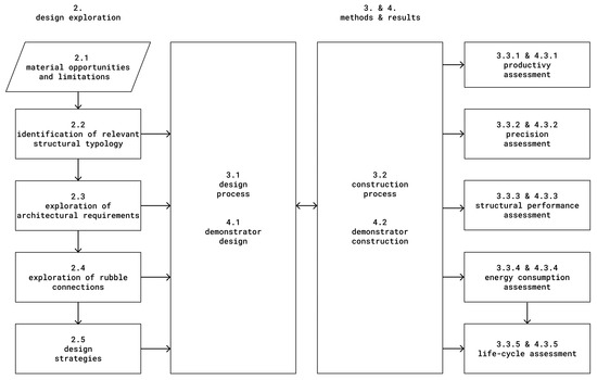 For the exploration, development, application and benchmarking of a relevant upcycling construction process using concrete rubble as the main material, this research and the corresponding sections in this paper follow the methodology illustrated in Figure 6. It is organised around three main steps. First, design exploration is performed in Section 2 to define the design brief and design strategies, based on the identification of opportunities and barriers. Then, methods related to the design process, the construction process, and performance assessments are developed in Section 3. The results of their application to a full-scale case study are laid out in Section 4, which follows the same sub-structure as Section 3. A discussion overarching these three sections is provided in Section 5.