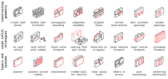 The category “constructing geometry” determines structural, spatial and aesthetic performances by aligning the rubble with brick masonry orientations (i.e., header, rowlock, stretcher, shiner, sailor, and soldier) along geometric design constraints (i.e., arched openings, rectangular boundary) and by varying the number of masonry layers. The “void-filling strategies” explore options related to flatness and airtightness, while “layers and systems” anticipate the improvement of visual, thermal, structural, technical and acoustic properties.