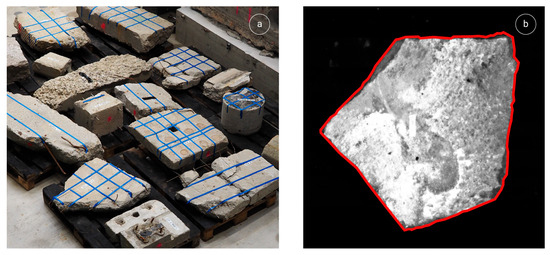 Typical piles of concrete rubble in recycling centres containing pieces of various sizes, including (a) flat pieces with irregular side faces and (b) flat pieces with straight edges and elongated cuboids.