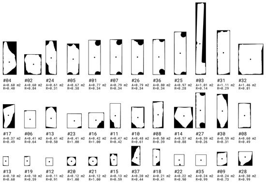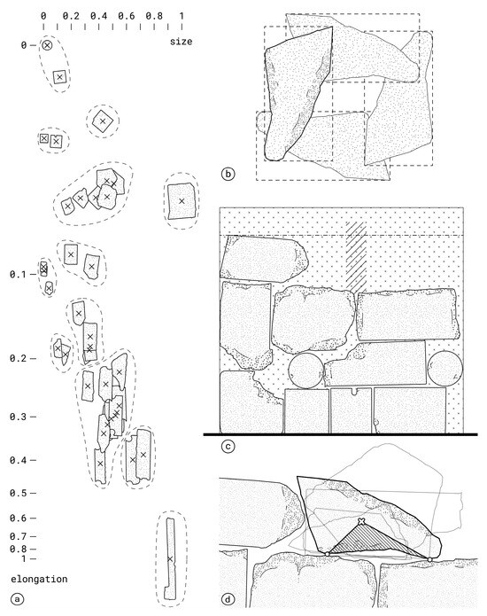 The design option meeting all requirements is the vertical stacking of large concrete rubble pieces along their “flat direction” in single-leaf masonry walls, as shown in Figure 9. Doing so enables the construction of walls as thin as the thickest rubble composing them. It also highlights the geometric specificities offered by concrete rubble compared to natural stone, such as the distinctive parallel flat sides, contributing to the flatness requirement. Thus, an agile arrangement of the flat elements can contribute to all requirements, while airtightness can be satisfied by filling masonry gaps with smaller rubble pieces and mortar. For the scope of this study, no openings nor connections with other structural components (e.g., beams, slabs) are considered.