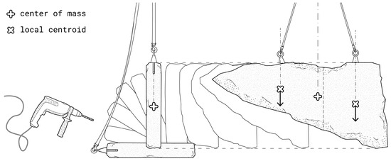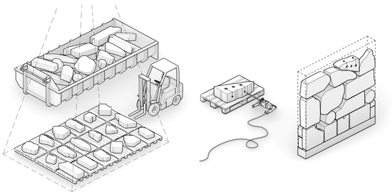 Other studies from ETH researchers propose the use of as-found rubble for the dry assembly of small-scale wall mock-ups using robotic arms [23,24]. Such assemblies using desktop-size robotic arms have been explored by Grangeot et al. [25] and Li et al. [26]. Marshall suggests rearrangements of irregular concrete debris for the construction of an arch bridge by filling the remaining voids with 3D-printed concrete [27]. Relatedly, 3D printing is considered a solution for bespoke connectors between concrete rubble fragments in a teaching context [28], under the initiative “Design with Debris” [29]. Connecting irregular concrete rubble pieces can also be achieved by using cables or jamming within tensile lattices, as developed by Khalil Yaqoob Al Khayat [30]. The reprocessing of rubble pieces through stereotomy-like approach has also been explored by Siefert [31] to design a pedestrian bridge. The connections with negative wood pieces through milling have also been proposed by [32]. The jamming of fine demolition rubble has been proposed by Blödel [33]. Taxonomies of geometries and tools have been proposed by Grangeot et al. [34] and Wyller et al. [35]. These digital design strategies that consider concrete rubble as building material lack full-scale implementations, thus reducing their constructive feasibility and applicability.