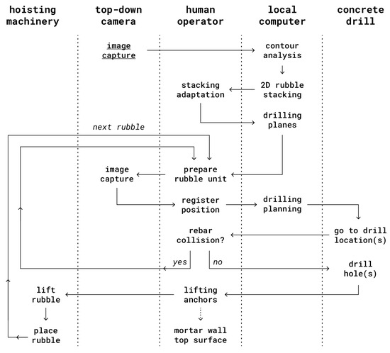 - Wyller, M.; Svatoš-Ražnjević, H.; Schad, E.; Menges, A. A Taxonomy of Techniques and Tools for Rubble. In Proceedings of the Scalable Disruptors, Kassel, Germany, 16–18 September 2024; Eversmann, P., Gengnagel, C., Lienhard, J., Ramsgaard Thomsen, M., Wurm, J., Eds.; Springer Nature: Cham, Switzerland, 2024; pp. 3–14. [Google Scholar]
